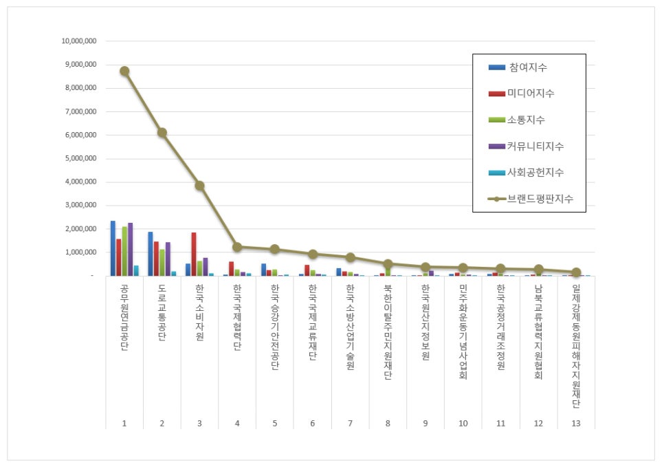 1위, 공무원연금공단 브랜드는 참여지수 2,196,265 미디어지수 1,613,896 소통지수 1,108,194 커뮤니티지수 278,475 사회공헌지수 431,893이 되면서 브랜드평판지수 5,628,722로 분석됐다. 지난 12월 브랜드평판지수 8,747,155와 비교해보면 35.65% 하락했다.