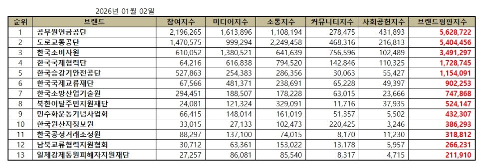 행정안전 공공기관 브랜드평판 2026년 1월 빅데이터 분석결과, 1위 공무원연금공단 2위 도로교통공단 3위 한국소비자원 순으로 분석되었다.