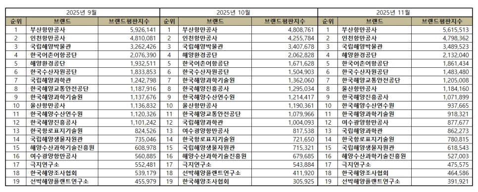 2025년 11월 해양수산부 공공기관 브랜드평판 순위는 부산항만공사, 인천항만공사, 국립해양박물관, 해양환경공단, 한국어촌어항공단, 한국수산자원공단, 한국해양교통안전공단, 울산항만공사, 한국해양진흥공사, 한국해양수산연수원, 한국해양과학기술원, 여수광양항만공사, 국립해양과학관, 한국항로표지기술원, 국립해양생물자원관, 해양수산과학기술진흥원, 극지연구소, 한국해양조사협회, 선박해양플랜트연구소 순이었다.