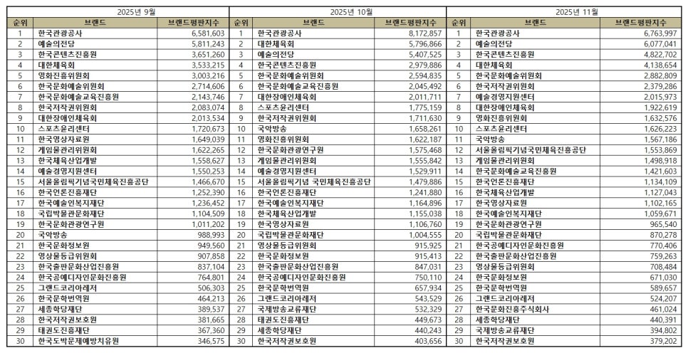 문화체육관광부 공공기관 브랜드평판 2025년 11월 빅데이터 분석결과, 1위 한국관광공사 2위 예술의전당 3위 한국콘텐츠진흥원 순으로 분석되었다.