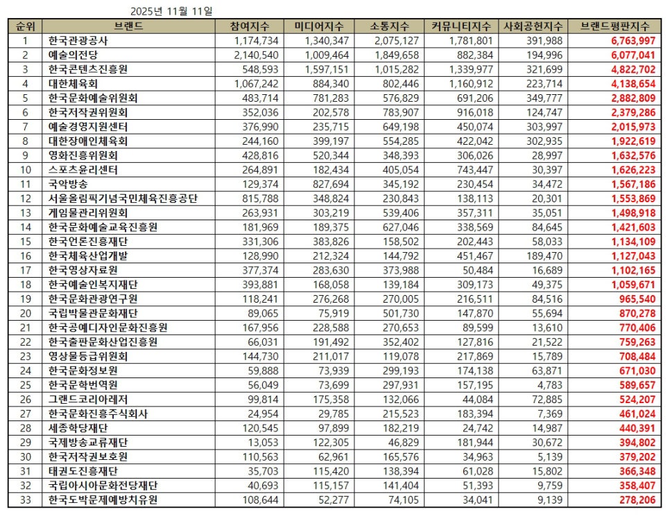 한국기업평판연구소 ( 소장 구창환 ) 는 국내 브랜드의 평판지수를 매달 측정하여 브랜드 평판지수의 변화량을 발표하고 있다. 2025년 11월 문화체육관광부 공공기관 브랜드평판지수는 2025년 10월 11일부터 2025년 11월 11일까지의 33개 문화체육관광부 공공기관 브랜드에 대한 빅데이터 분석 결과이다.