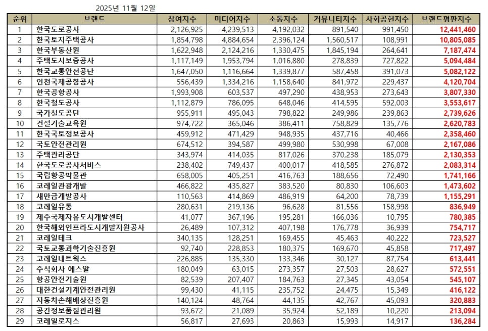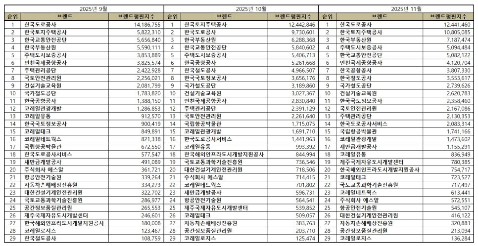 국토교통부 공공기관 브랜드평판 2025년 11월 빅데이터 분석결과, 1위 한국도로공사 2위 한국토지주택공사 3위 한국부동산원 순으로 분석되었다.
