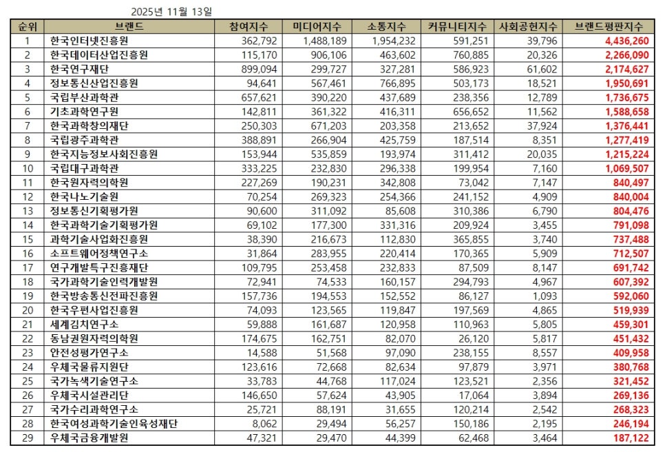 한국기업평판연구소 ( 소장 구창환 ) 는 국내 브랜드의 평판지수를 매달 측정하여 브랜드 평판지수의 변화량을 발표하고 있다. 2025년 11월 과학기술정보통신부 공공기관 브랜드평판지수는 2025년 10월 13일부터 2025년 11월 13일까지의 29개 과학기술정보통신부 공공기관 브랜드에 대한 빅데이터 분석 결과이다.