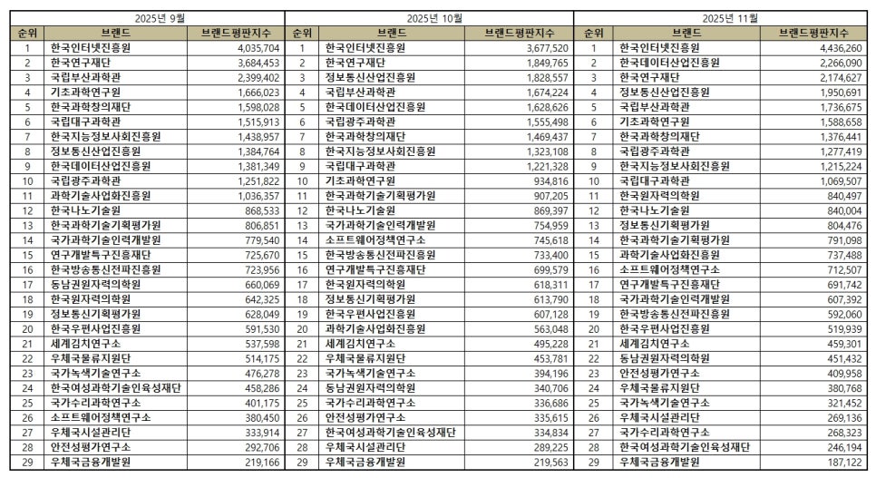 과학기술정보통신부 공공기관 브랜드평판 2025년 11월 빅데이터 분석결과, 1위 한국인터넷진흥원 2위 한국데이터산업진흥원 3위 한국연구재단 순으로 분석되었다.