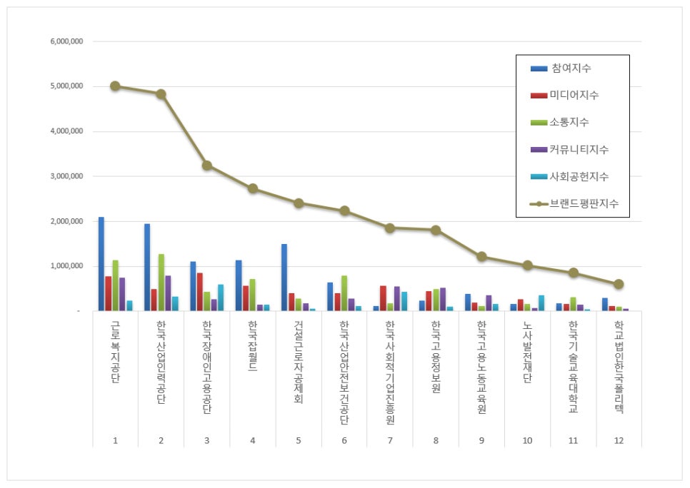 1위, 근로복지공단 브랜드는 참여지수 2,094,591 미디어지수 777,719 소통지수 1,142,615 커뮤니티지수 748,172 사회공헌지수 243,593이 되면서 브랜드평판지수 5,006,689로 분석됐다. 지난 10월 브랜드평판지수 6,300,668과 비교해보면 20.54% 하락했다.