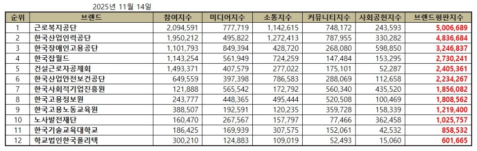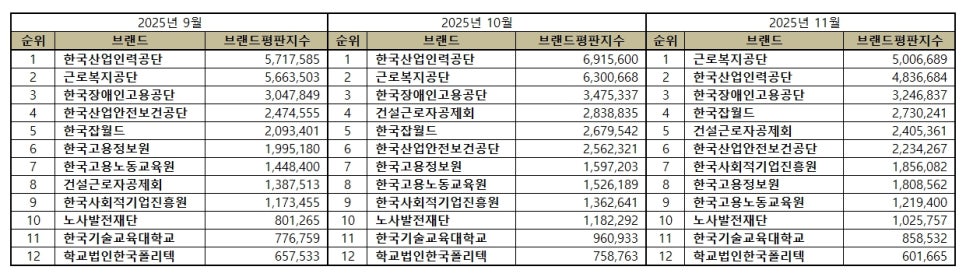 고용노동부 공공기관 브랜드평판 2025년 11월 빅데이터 분석결과, 1위 근로복지공단 2위 한국산업인력공단 3위 한국장애인고용공단 순으로 분석되었다.