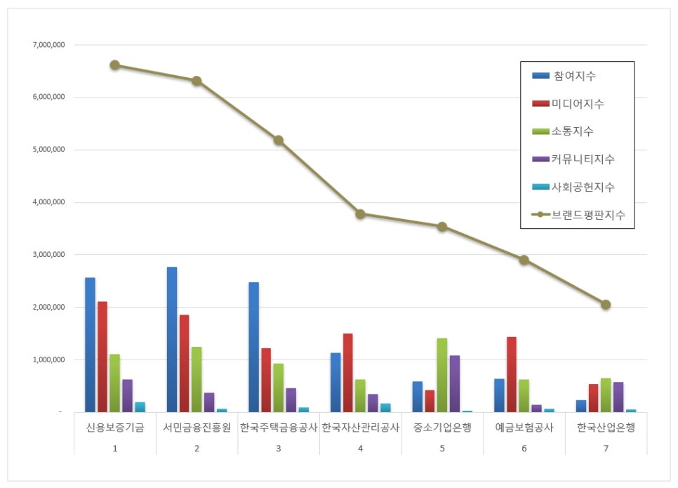 1위, 신용보증기금 브랜드는 참여지수 2,572,130 미디어지수 2,104,654 소통지수 1,110,081 커뮤니티지수 629,258 사회공헌지수 198,646이 되면서 브랜드평판지수 6,614,770으로 분석됐다. 지난 10월 브랜드평판지수 7,150,812와 비교해보면 7.50% 하락했다.