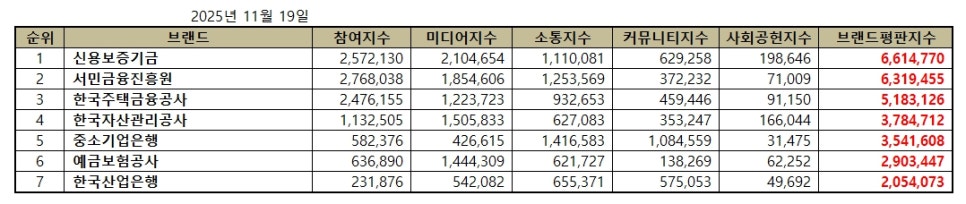 2025년 11월 금융위원회 공공기관 브랜드평판 순위는 신용보증기금, 서민금융진흥원, 한국주택금융공사, 한국자산관리공사, 중소기업은행, 예금보험공사, 한국산업은행 순이었다.