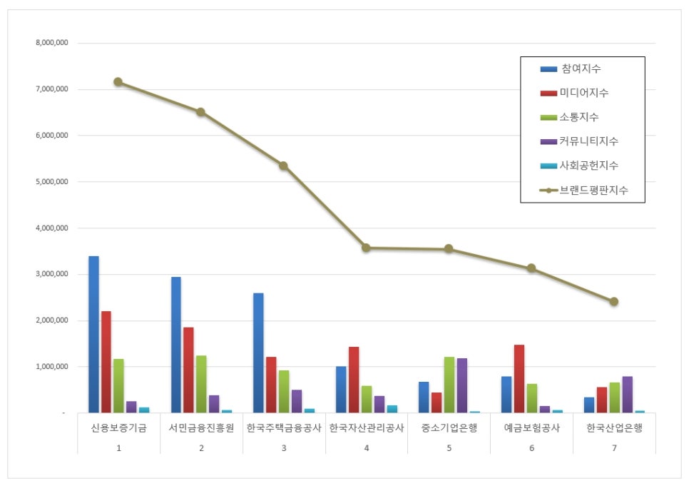 2025년 10월 금융위원회 공공기관 브랜드평판 순위는 신용보증기금, 서민금융진흥원, 한국주택금융공사, 한국자산관리공사, 중소기업은행, 예금보험공사, 한국산업은행 순이었다.