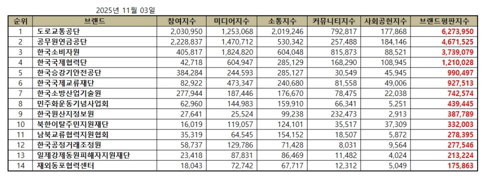 행정안전 공공기관 브랜드평판 2025년 11월 빅데이터 분석결과, 1위 도로교통공단 2위 공무원연금공단 3위 한국소비자원 순으로 분석되었다.
