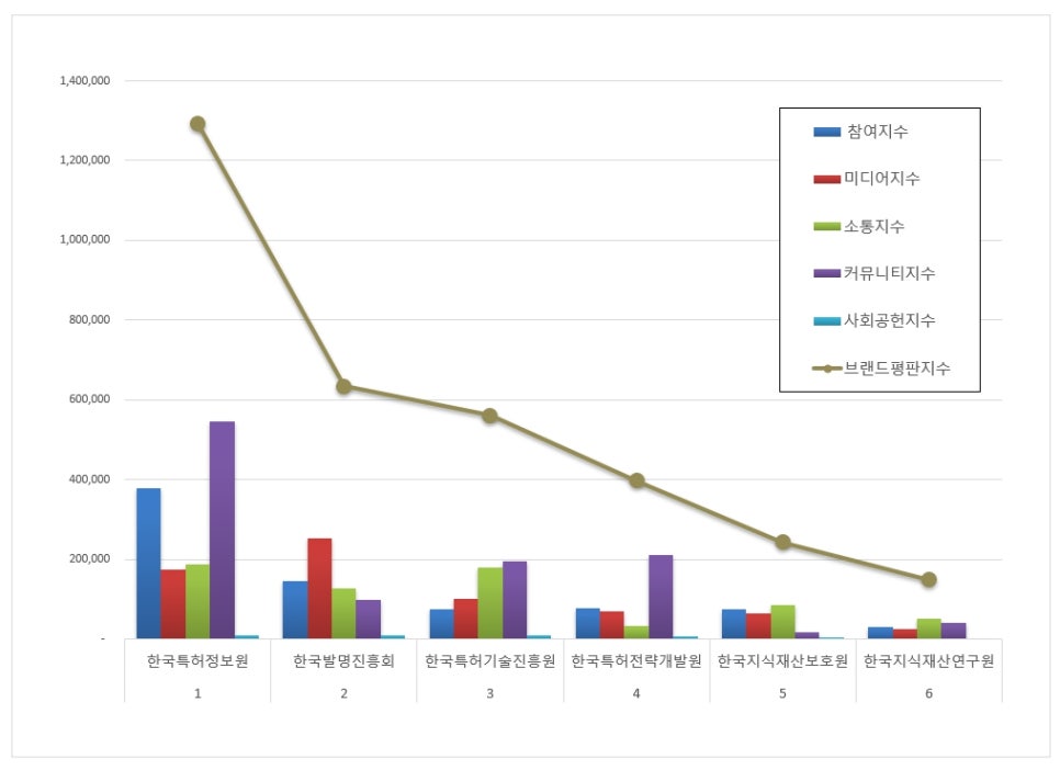 5위, 한국지식재산보호원 브랜드는 참여지수 74,093 미디어지수 64,386 소통지수 84,939 커뮤니티지수 16,219 사회공헌지수 2,744가 되면서 브랜드평판지수 242,381로 분석됐다. 지난 8월 브랜드평판지수 298,804와 비교해보면 18.88% 하락했다.