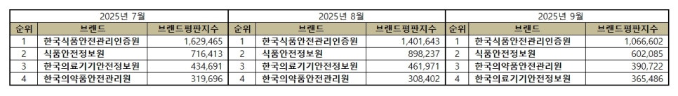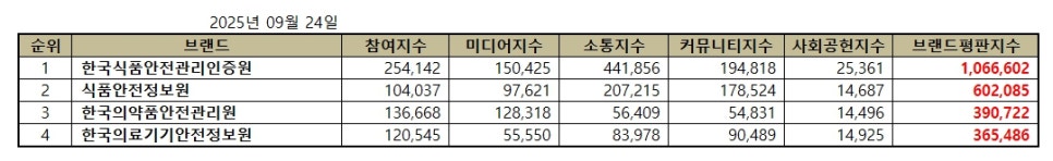 식품의약품안전처 공공기관 브랜드평판 2025년 9월 빅데이터 분석결과, 1위 한국식품안전관리인증원 2위 식품안전정보원 3위 한국의약품안전관리원 순으로 분석되었다.