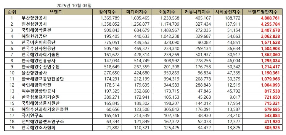 해양수산부 공공기관 브랜드평판 2025년 10월 빅데이터 분석결과, 1위 부산항만공사 2위 인천항만공사 3위 국립해양박물관 순으로 분석되었다.