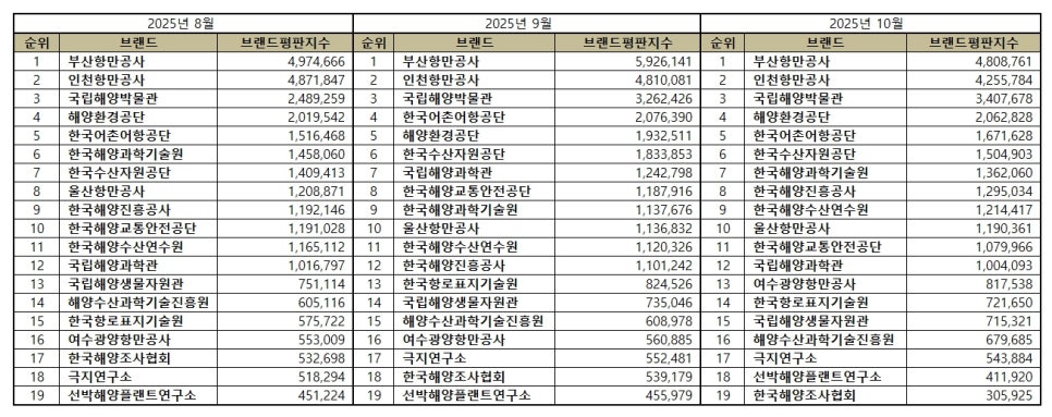 2025년 10월 해양수산부 공공기관 브랜드평판 순위는 부산항만공사, 인천항만공사, 국립해양박물관, 해양환경공단, 한국어촌어항공단, 한국수산자원공단, 한국해양과학기술원, 한국해양진흥공사, 한국해양수산연수원, 울산항만공사, 한국해양교통안전공단, 국립해양과학관, 여수광양항만공사, 한국항로표지기술원, 국립해양생물자원관, 해양수산과학기술진흥원, 극지연구소, 선박해양플랜트연구소, 한국해양조사협회 순이었다.