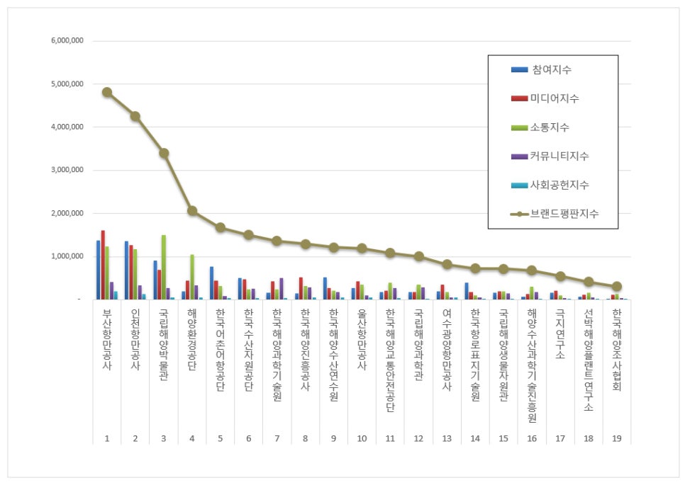 1위, 부산항만공사 브랜드는 참여지수 1,369,789 미디어지수 1,605,465 소통지수 1,239,568 커뮤니티지수 405,167 사회공헌지수 188,772가 되면서 브랜드평판지수 4,808,761로 분석됐다. 지난 9월 브랜드평판지수 5,926,141과 비교해보면 18.86% 하락했다.