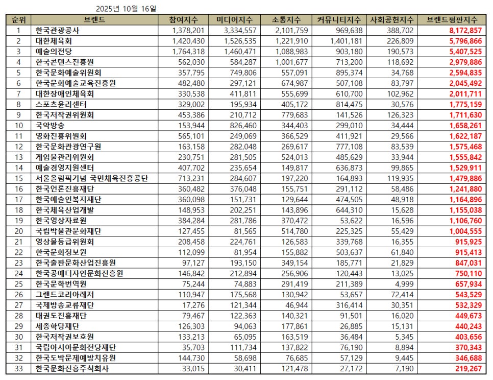 한국기업평판연구소 ( 소장 구창환 ) 는 국내 브랜드의 평판지수를 매달 측정하여 브랜드 평판지수의 변화량을 발표하고 있다. 2025년 10월 문화체육관광부 공공기관 브랜드평판지수는 2025년 9월 16일부터 2025년 10월 16일까지의 33개 문화체육관광부 공공기관 브랜드에 대한 빅데이터 분석 결과이다.