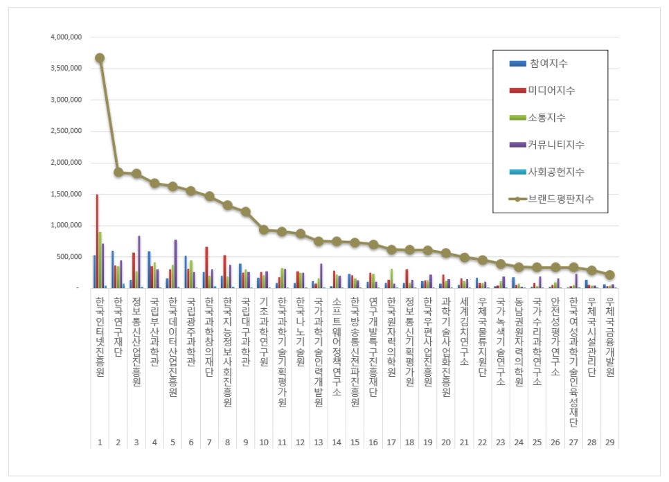 1위, 한국인터넷진흥원 브랜드는 참여지수 525,135 미디어지수 1,498,336 소통지수 897,987 커뮤니티지수 709,913 사회공헌지수 46,150이 되면서 브랜드평판지수 3,677,520으로 분석됐다. 지난 9월 브랜드평판지수 4,035,704와 비교해보면 8.88% 하락했다.