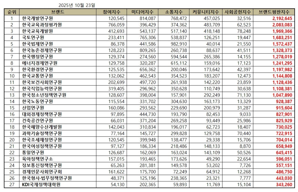 국무조정실 공공기관 브랜드평판 2025년 10월 빅데이터 분석결과, 1위 한국개발연구원 2위 한국교육과정평가원 3위 한국교육개발원 순으로 분석되었다.