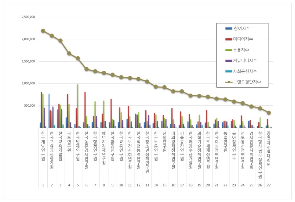 1위, 한국개발연구원 브랜드는 참여지수 120,545 미디어지수 814,087 소통지수 768,472 커뮤니티지수 457,025 사회공헌지수 32,516이 되면서 브랜드평판지수 2,192,645로 분석됐다. 지난 9월 브랜드평판지수 2,282,429와 비교해보면 3.93% 하락했다.