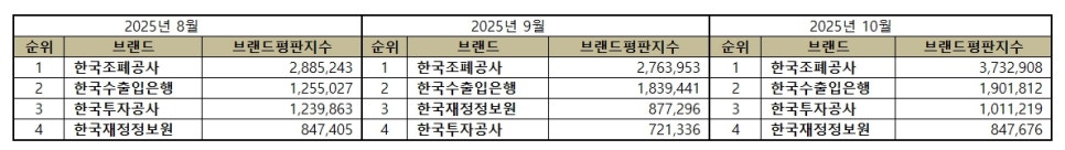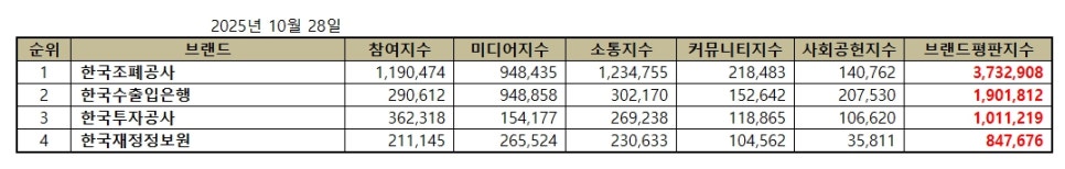 기획재정부 공공기관 브랜드평판 2025년 10월 빅데이터 분석결과, 1위 한국조폐공사 2위 한국수출입은행 3위 한국투자공사 순으로 분석되었다.