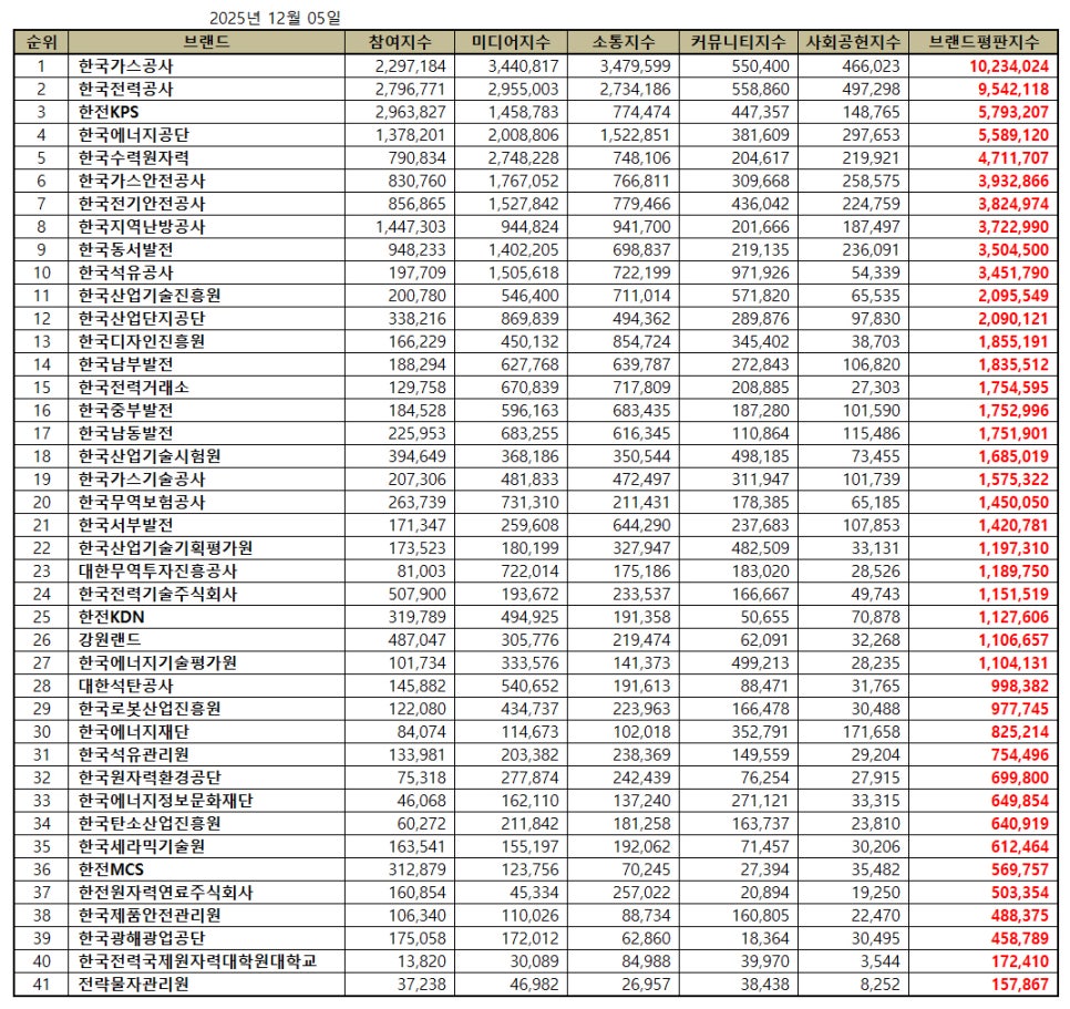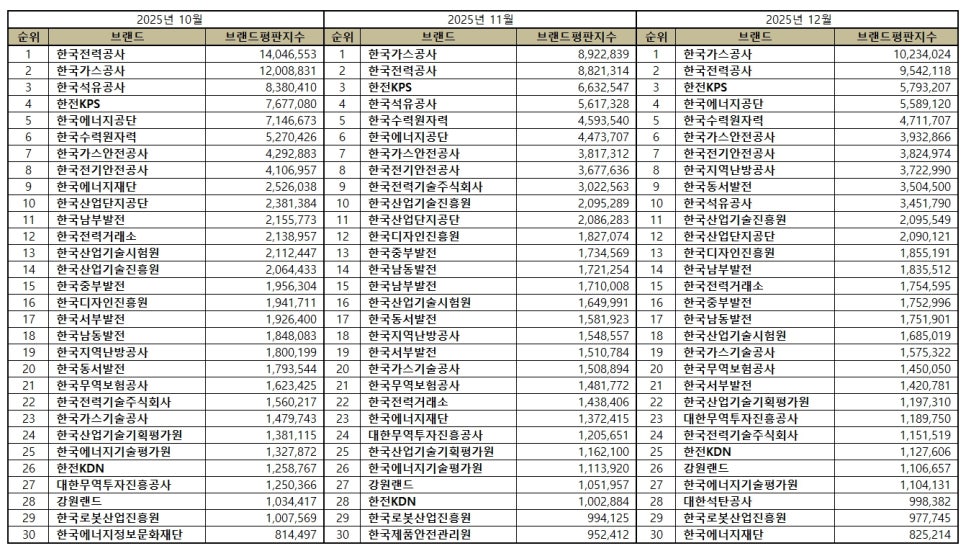 산업통상자원부 공공기관 브랜드평판 2025년 12월 빅데이터 분석결과, 1위 한국가스공사 2위 한국전력공사 3위 한국KPS 순으로 분석되었다.