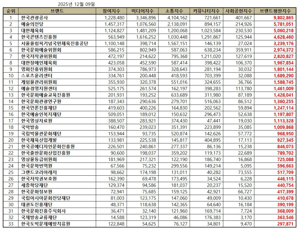 한국기업평판연구소 ( 소장 구창환 ) 는 국내 브랜드의 평판지수를 매달 측정하여 브랜드 평판지수의 변화량을 발표하고 있다. 2025년 12월 문화체육관광부 공공기관 브랜드평판지수는 2025년 11월 9일부터 2025년 12월 9일까지의 33개 문화체육관광부 공공기관 브랜드에 대한 빅데이터 분석 결과이다.