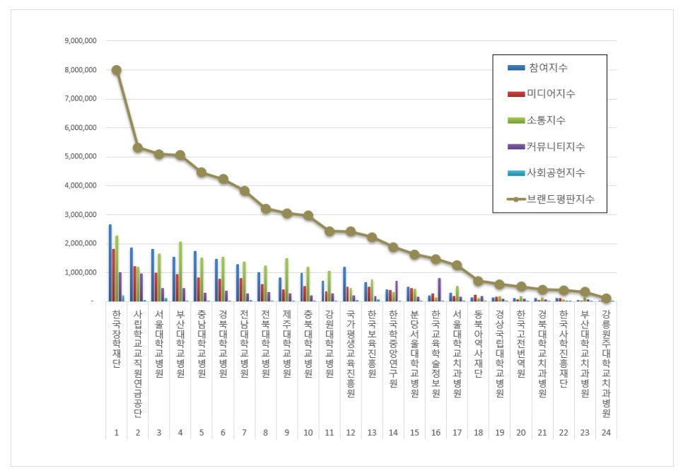 4위, 부산대학교병원 브랜드는 참여지수 1,542,348 미디어지수 942,664 소통지수 2,074,281 커뮤니티지수 466,738 사회공헌지수 38,716이 되면서 브랜드평판지수 5,064,747로 분석됐다. 지난 11월 브랜드평판지수 4,872,666과 비교해보면 3.94% 상승했다.
