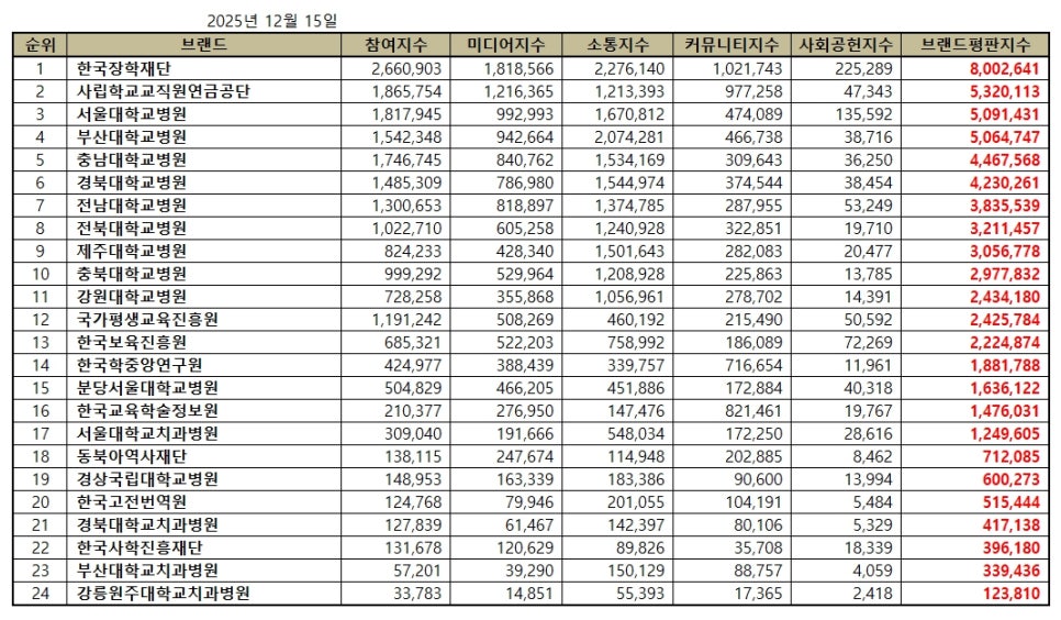 교육부 공공기관 브랜드평판 2025년 12월 빅데이터 분석결과, 1위 한국장학재단 2위 사립학교교직원연금공단 3위 서울대학교병원 순으로 분석되었다.