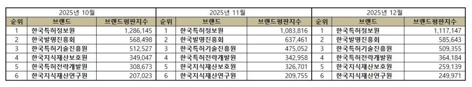 [브랜드평판] 특허청 공공기관 브랜드 2025년 12월 빅데이터 분석결과...1위 한국특허정보원, 2위 한국발명진흥회, 3위 한국특허기술진흥원