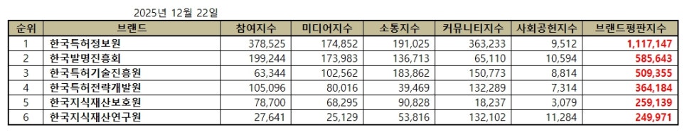 2025년 12월 특허청 공공기관 브랜드평판 순위는 한국특허정보원, 한국발명진흥회, 한국특허기술진흥원, 한국특허전략개발원, 한국지식재산보호원, 한국지식재산연구원 순이었다.