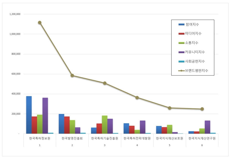 1위, 한국특허정보원 브랜드는 참여지수 378,525 미디어지수 174,852 소통지수 191,025 커뮤니티지수 363,233 사회공헌지수 9,512가 되면서 브랜드평판지수 1,117,147로 분석됐다. 지난 11월 브랜드평판지수 1,083,816과 비교해보면 3.08% 상승했다.